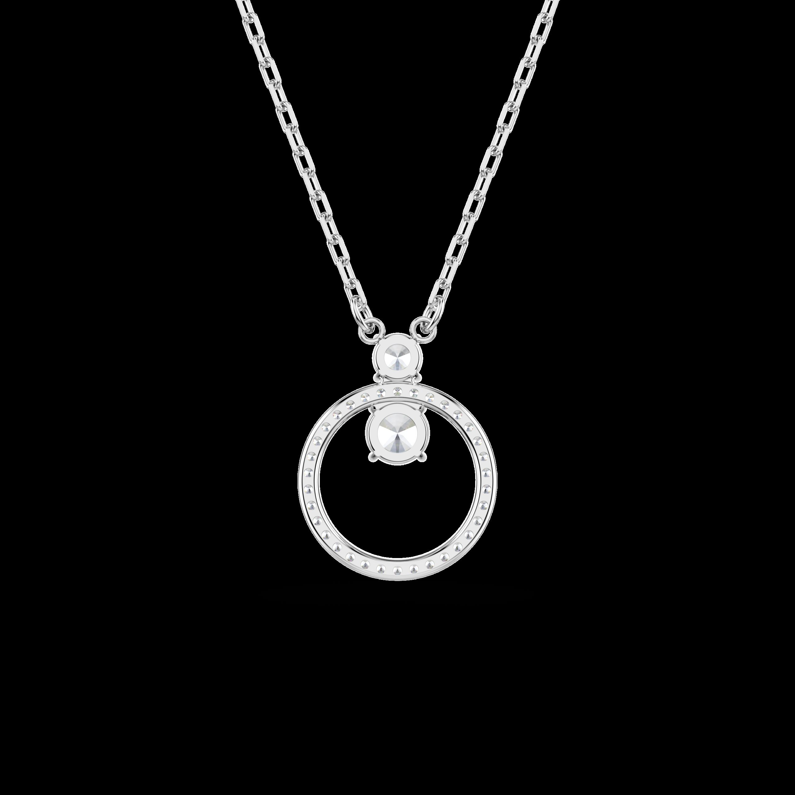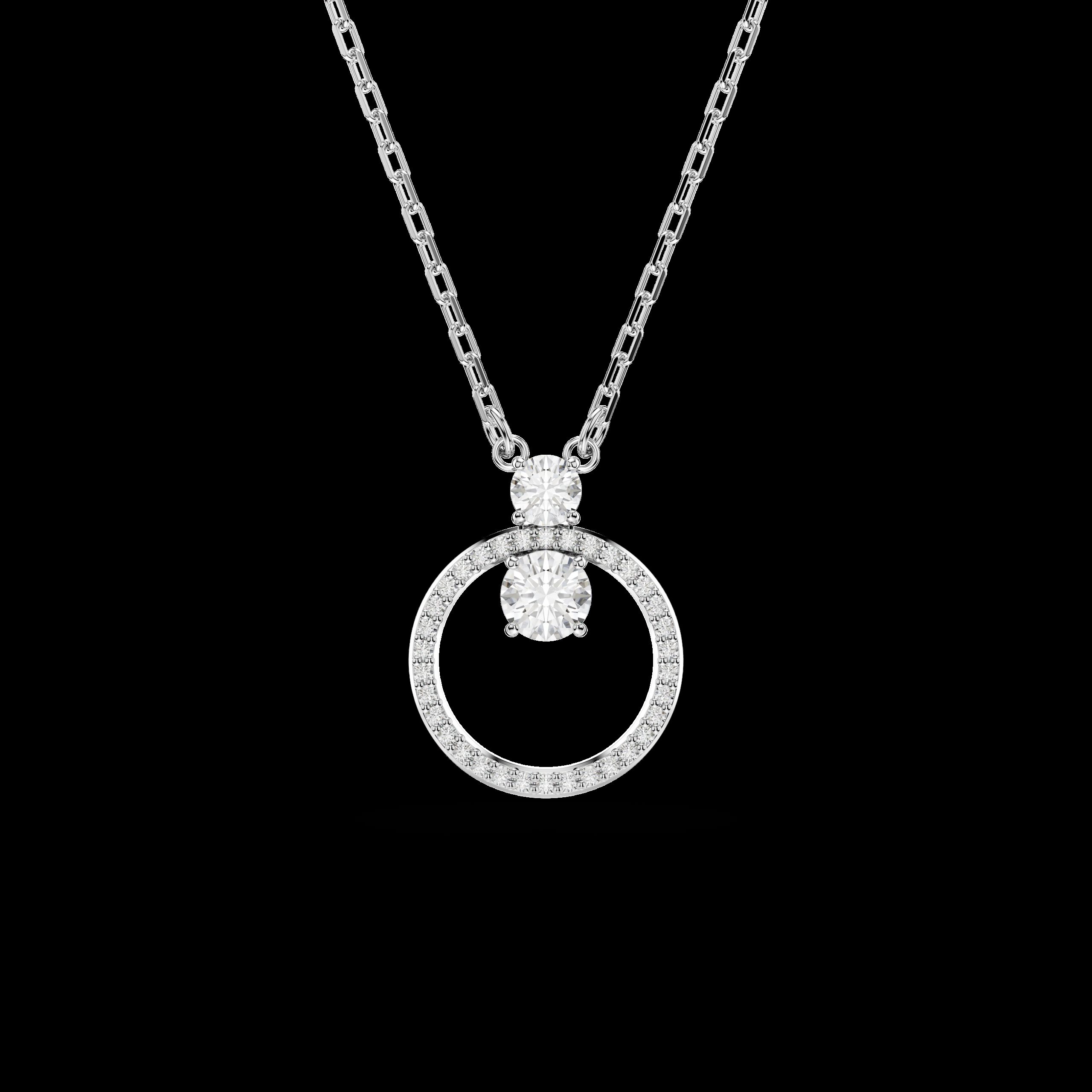 Una reinterpretazione in chiave moderna del classico pendente circolare, questa creazione placcata rodio presenta un anello centrale in pavรฉ di Swarovski Zirconia trasparenti, con due Swarovski Zirconia montate a griffe piรน grandi che lo fissano in posizione. Uno straordinario esempio di eleganza creativa, questo pendente risplende da solo o accende una scintilla di intrigo quando abbinato agli orecchini Constella coordinati.